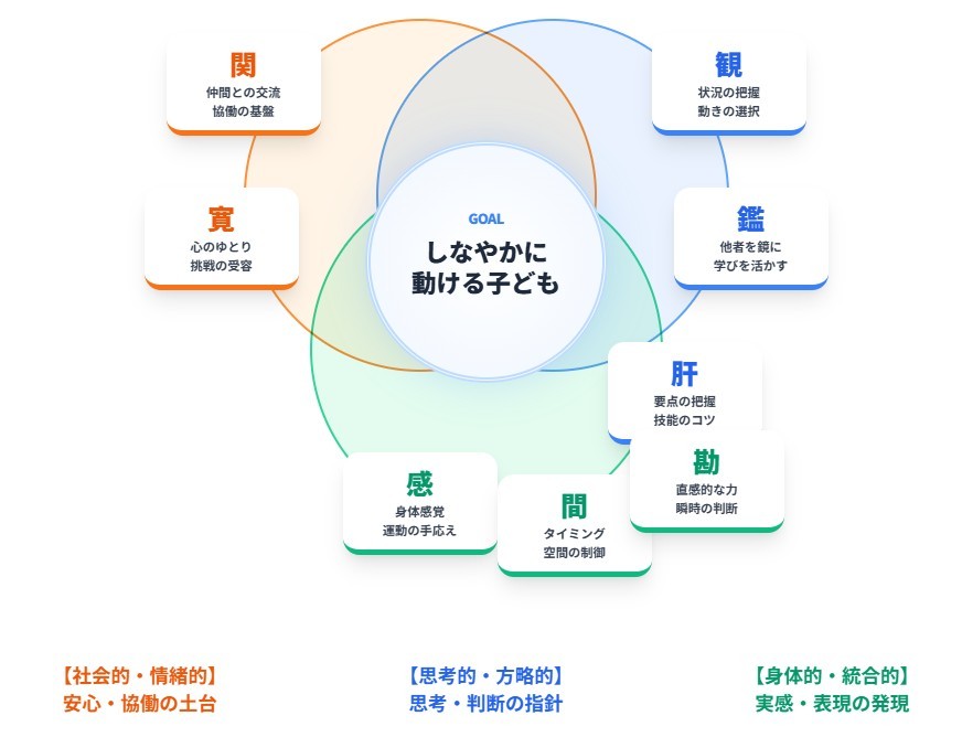 さて、小学校1年生は感覚が未分化で「動くことそのもの」に喜びを感じる時期です。この時期に、「カン」の中でも特に「感(身体感覚)」「間(空間・時間)」「勘(直感)」「関(仲間)」の基礎を耕すことで、運動への主体的な関わりと多面的な資質・能力を育みながらしなやかに動ける子どもの育成を目指します。