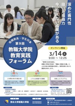 本フォーラムは「教職大学院の教育実践報告オンライン研究会」として、県内外小中学校教職員・教育行政関係者の皆様や教職を目指す学生に教職大学院の取組を公開し、教育現場・教育行政との実践交流・研究交流を推進することを目的としています。多くの皆様にご参加いただき、本教職大学院の理念である「理論と実践の往還」を実感していただければ幸いです。